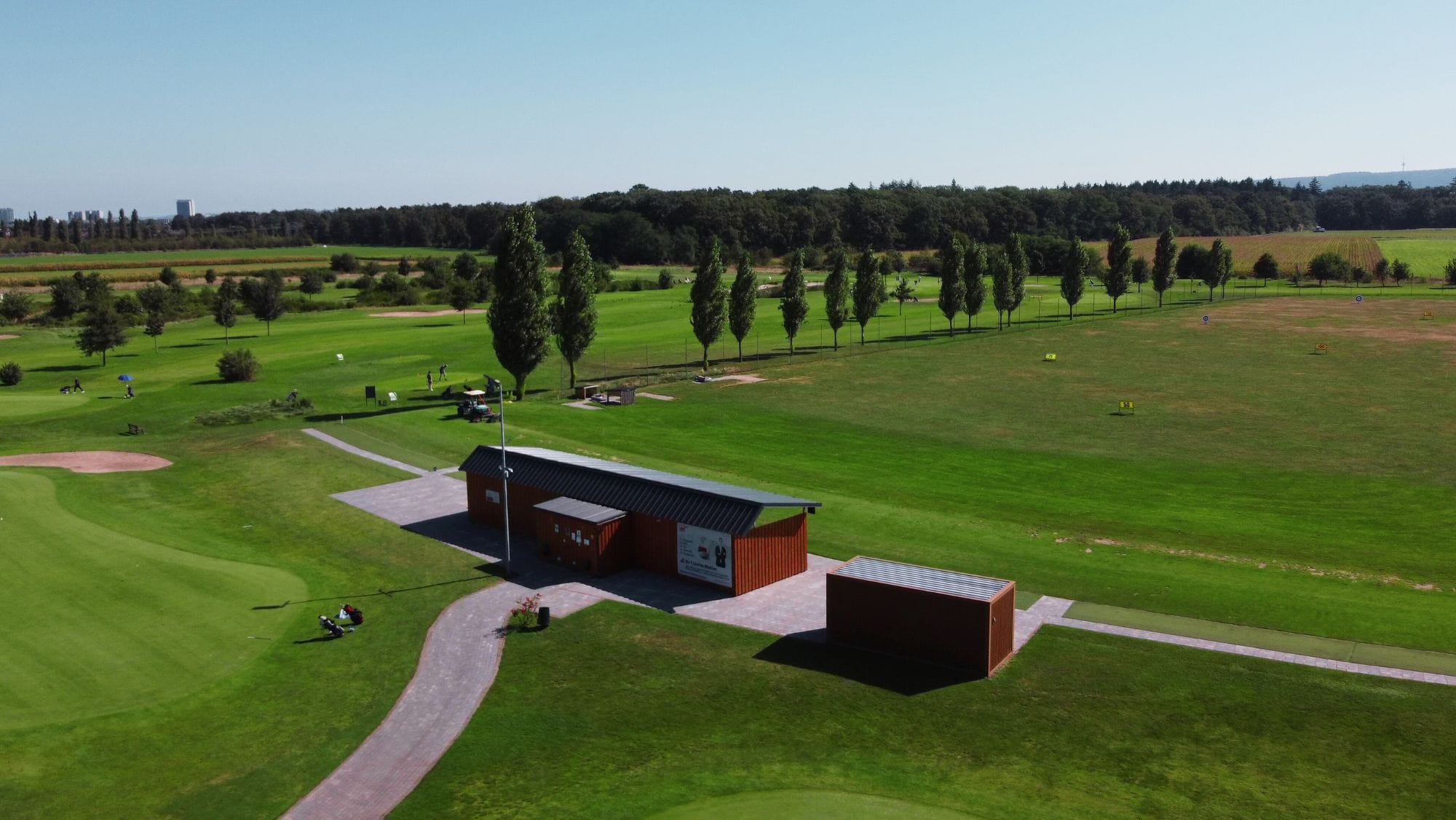 Unsere Driving Range verfügt über 6 überdachte Abschläge sowie Rasenabschläge und hochwertige Teeliner mit einer Länge von 60 Metern. Zusätzlich bieten wir ein großzügiges Puttingareal mit 380 qm sowie Chipping- und Pitchingareal mit 670 qm und zwei Übungsbunkern. Die Länge der Driving Range erstreckt sich über eine Länge von mehr als 200 Metern, sodass Du ausreichend Länge für deine Trainingseinheiten hast.